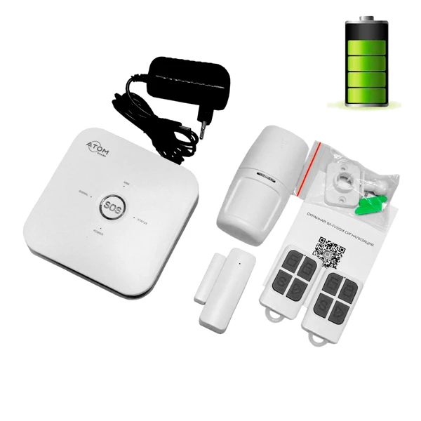 Комплект содержит: 1 беспроводной датчик движения, 1 беспроводной датчик открытия, 2 пульта для постановки/снятия с охраны, контрольная панель. При монтаже прокладывать провода не требуется благодаря работе с беспроводными охранными датчиками.